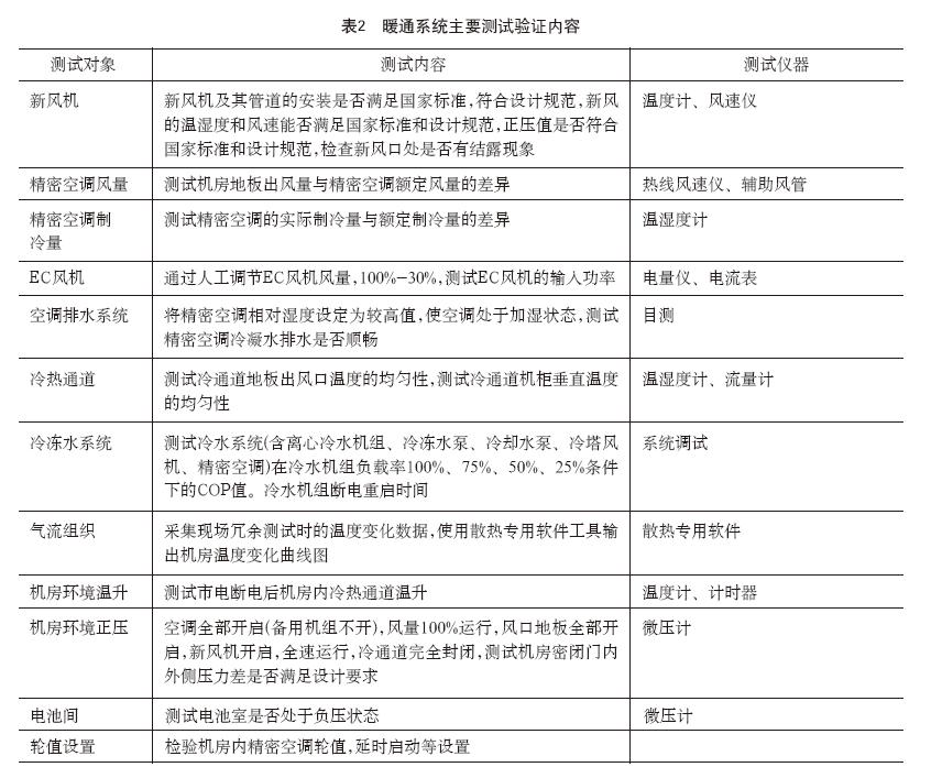 暖通系统的测试验证工作主要是验证空调及相关设备的性能和运行参数是否符合设计要求,证暖通系统是否能满足设计负载对制冷量的要求,验证系统作为一个整体是否能满足运行要求并与其他系统匹配运行,验证系统在故障情况下是否能做出预期的反应并有一定的抗故障能力。有关暖通系统的测试验证主要工作内容见表2。